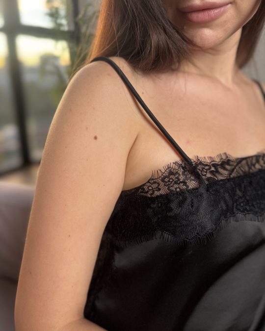 Головний акцент — ніжне мереживо , яке обрамляє V-виріз та асиметричний низ. Такий крій створює ефект плавних хвиль, роблячи топ візуально легким, повітряним і неймовірно витонченим. Тонка бретель додає делікатності, а мереживна обробка підкреслює природну красу та ніжність силуету.